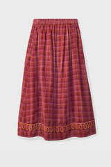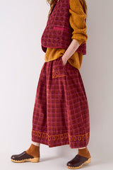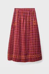 The Karina Skirt in check-printed cord features a full lining, two practical side pockets, and delicate cornelli embroidery along the pockets and hem.