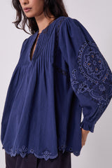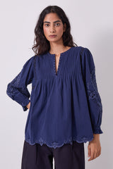 The Pavlina Embroidered Top, Made from lightweight, breathable cotton, this top features delicate pintuck detailing along the neckline. Intricate embroidery adorns the sleeves and shoulders, showcasing timeless craftsmanship in contrasting threadwork. Relaxed fit and scalloped hem.