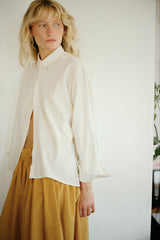 Our iconic Tina skirt in a superfine needlecord in a rich yellow ochre. The needlecord is light as air, soft and velvety and drapes beautifully. The golden yellow is the colour of Autumn leaves and pairs beautifully with our mist Ada Donegal sweater.