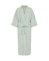 Our green ditsy stripe robe is hand printed in Jaipur and is perfect for getting ready in, lazy days at home and to throw on at the beach. They are made with light, floaty 100% cotton, have two pockets and a waist tie, and come in one size. They have a slightly cropped arm length so no need for rolling up your sleeves!