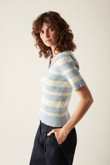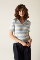 In cream and blue stripe this is a pretty cotton summer jumper. The sailor collar takes this ribbed knit from the ordinary to the stylish. The soft handle and stretch fit makes this a very comfortable summer jumper.