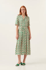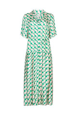Designed in-house this checkerboard print shirt dress gives a sophisticated look in  a soft, flowing fabric.  A button through front, tie belt and soft pleats at the hip make this a  flattering midi length dress.   Skirt also available in this print.
