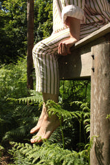 Tapered ankle length trouser. Flat fronted waistband, elasticated at the back. They have two front pockets and one back pocket. These trousers are easy and a joy to wear.