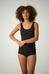 The perfect tank-short combination in 100% organic cotton rib. Great for layering, or use as a super comfortable sleep set. Available in natural white and black.Long in the body and cut long in the straps, the Annie tank is just shy of too low at the front and sexily low at the back. The Bettie short is cut low on the hip and shows just enough cheek at the back. Understated and classy, this set will see you through day to night, with jeans, under a sweater or perfect on its own to sleep in.