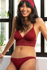 La nouvelle star de votre garde-robe, c'est lui, notre bustier bi-matière Dawa : coton biologique certifié GOTS, dentelle grenat en fibre recyclée et coupe sans armatures, c'est la formule magique pour un bustier féminin et ultra confortable !