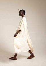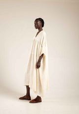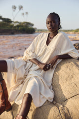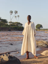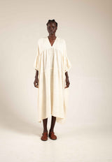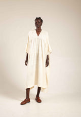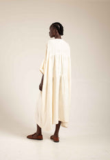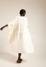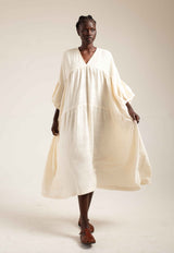 A season staple and a dress that can be worn to any occasion. The Maxi dress features a voluminous free size silhouette with tiered panels, a v neckline and 3/4 bell sleeves.