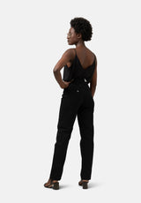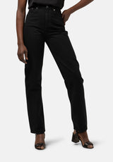High-rise stove pipe. Cropped at the ankles. Classic five-pocket styling. Matt black and white buttons and rivets. Non-stretch denim. 40% post-consumer recycled cotton, 60 % organic cotton.