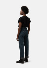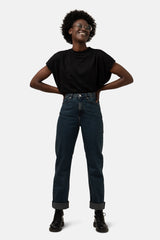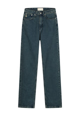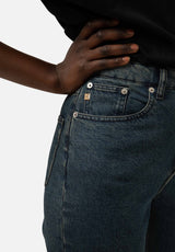 Our favourite new style. Straight fit. High-rise stove pipe. Classic five-pocket styling. Matt black buttons and rivets. Non-stretch denim. 40% post-consumer recycled cotton, 60 % organic cotton.