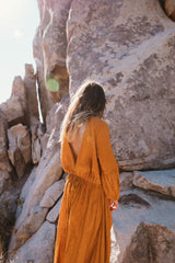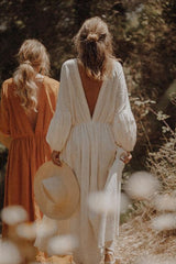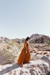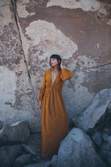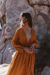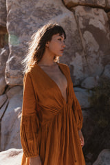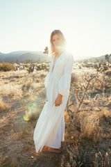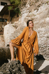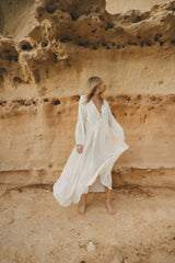 A beautiful maxi dress with billowing sleeves, crafted from organic cotton. The Wild Heart dress is a bohemian dream for sunny days and magical evenings with a flowing and bold silhouette. Front ties allow the plunging neckline to be closed slightly or remain open for a more dramatic appeal.