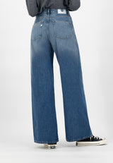Wyde Sara, our loose jeans. Wide Fit. High Waist. Wide Leg. Zip Fly. Satin-finish Silvertone button and rivets.