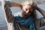 Our statement wrap, with an open ladder and fine stitch throughout. Creating a light yet warm piece to wrap up in or wear over the shoulders. The fine 1-ply wool creates the lightest fabric; barely there, yet with all the warmth of wool.