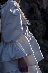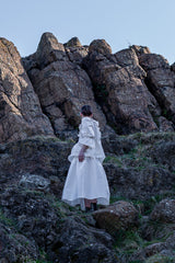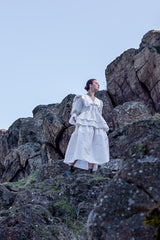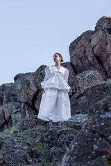Composition of romanticism and elegance, the Ada top is crafted from a crisp light-catching taffeta. It's a statement piece empowered by a unique hand-beaded chelsea collar. The top combines a loose bodice and double-layered peplum gathering. Dramatic puff sleeves are emphasized by flounce cuffs. Sculptural and modern — it's Ada...Shown with Lilly skirt.