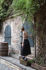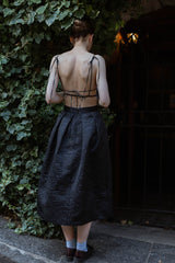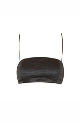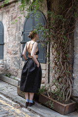 Delicate Hamna top is crafted from textured light catching black fabric. Fitted bodice, back knots and delicate straps embody femininity and open back creates charming character.