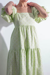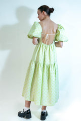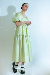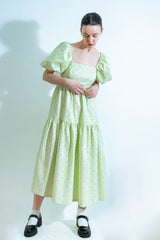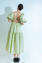 Dramatic and expressive maxi EDEN dress is crafted from light lime green geometrical jacquard. The voluminous silhouette combines a fitted bodice, tiered bottom skirt and short puff balloon sleeves. Delicate back knots and elastic bottom line gives movement freedom and open back creates charming character. Made to order in 1-2 weeks.