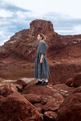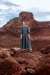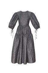 A textured jacquard, Luna dress combines elegance and delicate structure. A silhouette is composed of a tiered skirt, fitted bodice and elbow-length puff sleeves fixed with elastic knots. Subtle back bow ties and gathered seam around the waistline create a romantic feel. The iron grey colour and voluminous shape embody strong sculptural character.