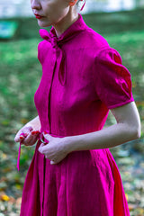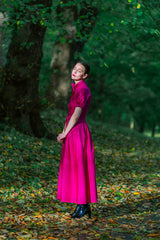 A bold fuchsia maxi dress combines femininity and elegance. A princess silhouette is composed of voluminous skirt, fitted bodice and short sleeves. Hidden button closure is highlighter by a bow which is tightened around the neck. The dress waist line is complimented by pleats and a belt. The unique linen weave like silk structure captures the light and creates a sculptural illusion.