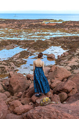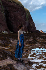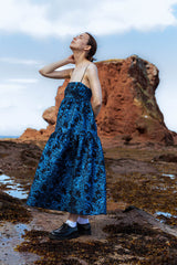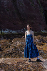 Midnight blue jacquard Valentina dress creates sculptural elegance. The silhouette combines an elegant fitted bodice with raised waistline, voluminous tiered maxi skirt, and delicate straps. Blue Valentina represents minimalism and playfulness.