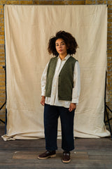 A neat v-neckline brings a sense of ease to our loose button-up vest in Olive Green. Timeless, easy throw on, baggy style with dropped armholes, to give plenty of room when wearing with shirts and sleeved dresses.