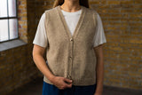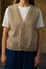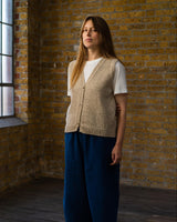 Knitted in a light beige and unbleached white marl, the yarn is undyed with so much depth and beauty in this natural shade. A neat v-neckline brings a sense of ease to our loose button-up vest. Timeless, easy throw on, baggy style with dropped armholes, to give plenty of room when wearing with shirts and sleeved dresses.