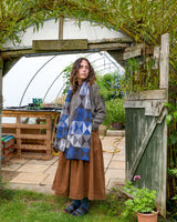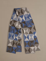Inspired by traditional quilting patterns, this scarf design blends traditional charm with a contemporary twist. Knitted in Windermere Blue, Dark Brown and Marble Grey - style with denim or gingham