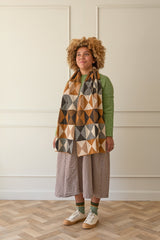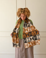 Inspired by traditional quilting patterns, this scarf design blends traditional charm with a contemporary twist. Knitted in Tobacco, Dark Brown and Oatmeal - style with denim or gingham