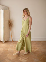 Made in London from a pear green medium weight 100% linen fabric, this jumpsuit features an easy-to-wear wide culotte style leg and elegant shape. Perfect for layering, this jumpsuit adds a touch of sophistication to your wardrobe.