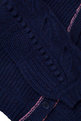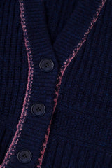 The narrow V-neckline pairs beautifully with Saywood favourites like the Etta and Rosa dresses, or our best-selling Lela Shirt, creating a layered silhouette that feels polished yet everyday. Crafted from 100% supersoft lambswool spun in Aberdeenshire in a rich, deep sea navy with hand-finished balloon sleeves and colour-matched natural buttons for a subtle statement. Contrasting soft pink stitching gives a whimsical nautical nod.