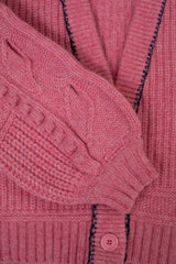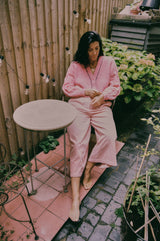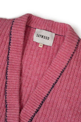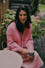 Spun from 100% supersoft Aberdeenshire lambswool, this cosy knit features balloon sleeves with hand-finished details and colour-matched, natural Corozo buttons. In soft pink with deep navy contrast stitching tracing the neckline and placket, it offers a fresh, modern take on a timeless cardigan.