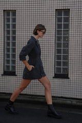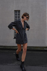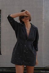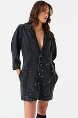 A tailored denim mini dress adorned with studs, the perfect holiday party look.