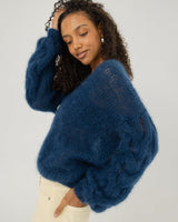 We call this cardigan Pagunda, the Lithuanian word for “lure.” In Lithuanian folklore, temptation is often cast as a force of nature - inevitable, undeniable. Crafted from mohair wool certified by the Responsible Wool Standard and silk, this navy knit is soft yet enduring. Its cable sleeves create an intricate rhythm, while the easy, hip-length fit makes it as wearable as it is alluring.