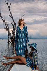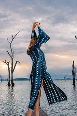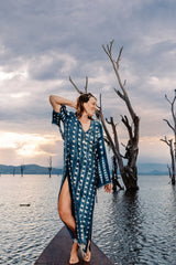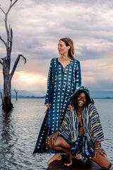 The Burkina Kaftan is crafted from handwoven cotton, naturally dyed with indigo using traditional methods passed down through generations in Burkina Faso, West Africa.