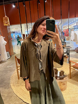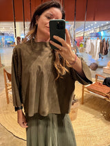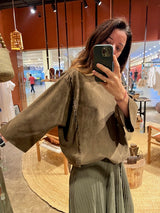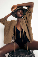 Designed for versatility, it can be worn both ways — with the tie suede knots styled at the front or the back. It features a wider, relaxed fit, half-length sleeves, and a decorative cut-suede seam across the shoulders. The jacket is left unlined, with raw edges and no pockets, embracing a minimal, natural finish that lets the beauty of the suede speak for itself.