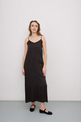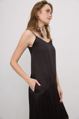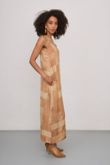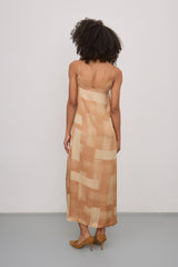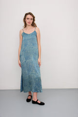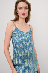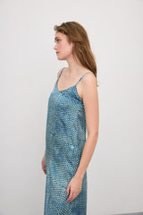 The Zafira Slip Dress is cut from luxurious, fluid silk that glides effortlessly over the skin. Falling just above the ankles, it offers an elongated, elegant silhouette. A subtle side slit adds graceful movement, while discreet pockets and an invisible zipper ensure a seamless, refined finish. Available in blue dotted, golden bronze, and black.
