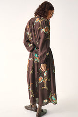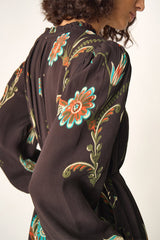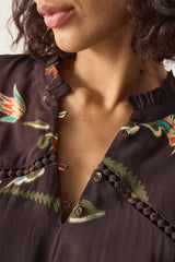 Light-weight viscose featuring a botanical print upon a cocoa base. Long sleeves with elasticated cuffs, gathering at shoulder seams, and a V-neckline with a subtle ruffled edge create a relaxed, flowing fit, made versatile by a rouleaux tie at the waist. Finished with an embroidered trim detailing and loop-and-shell button closures. Fully lined in ecovero viscose.