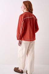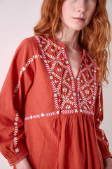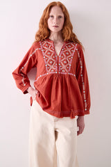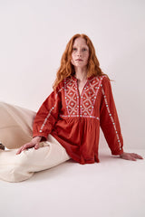 Crafted from 100% cotton, the Enda Top features intricate white and turquoise embroidery on a rich rust base. Designed with a relaxed fit, it has a deep V-neck, gathered waist, and soft flare through the body. Finished with embroidered sleeves and tassel details at the hem.