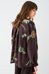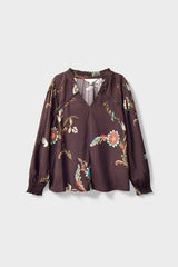 Light-weight viscose featuring a botanical print upon a cocoa base. A relaxed, flowing silhouette through a soft V-neckline with subtle ruffling, gentle gathering at the shoulders, and long sleeves finished with elasticated cuffs. Additional detailing include embroidered trims across chest and loop-and-shell button closures.
