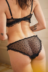 Jeu de transparence, petits coeurs en velours pailletés et coupe froufroutante : découvrez notre jolie culotte bloomer Amour en tulle recyclé. Jolies fesses garanties !