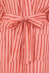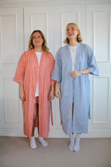 Our pink bobble stripe robe is hand printed in Jaipur and is perfect for getting ready in, lazy days at home and to throw on at the beach. They are made with light, floaty 100% cotton, have two pockets and a waist tie, and come in one size. They have a slightly cropped arm length so no need for rolling up your sleeves!