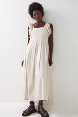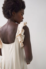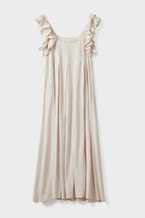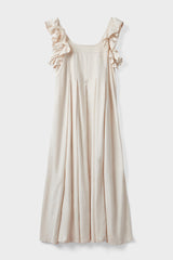 The Evie Dress in Pale Stone is crafted from a breathable linen blend. A curved square neckline and statement ruffle sleeves add modern romance, while sewn-down pleats release into gentle volume through the midaxi-length skirt. Fully lined for a smooth silhouette.