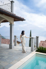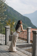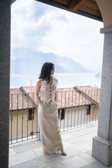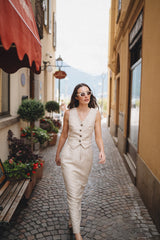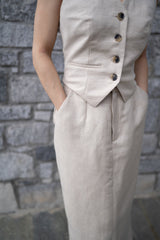 Expertly crafted from a wool and linen blend, creating a flattering tailored silhouette, intended to graze the ankles. Presented in a timeless natural shade, allowing for versatile styling. Featuring side pockets, a herringbone construction and finished perfectly with our signature back pocket button detailing.