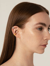 This refined yet distinctive ear cuff is the smallest piece in the collection. Its design allows it to fit perfectly on the upper rim of the ear. Spectacular on its own, but it becomes even more extravagant when worn together in gold and silver versions, or mixed with other ear cuffs, giving the wearer a truly bold look.
