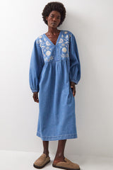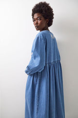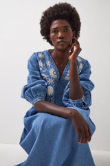 The Rosana Embroidered Denim Dress is an effortless, throw-on piece crafted from midweight, light-wash denim. Designed with a relaxed midi-length silhouette, it features a soft V-neckline, gathered cuffs, and delicate embroidery. The gently gathered waist sits away from the body, creating an easy, flattering shape.