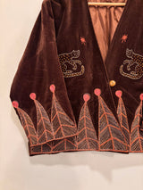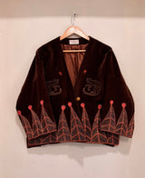 Made from old vintage velvet curtains that we collect at the street markets in Kenya, these jackets are all one of a kind treasures. Complemented by intricate embroidery on the hem and sleeves and a caracal cat good omen on the chest. The fit is loose and cropped.