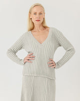 An extra thread of silk is plaited through the knit, enhancing the fabric’s unique texture with a subtle shimmer and a sumptuous hand feel. The V-neckline of the sweater is finished with a refined ribbed trim, while the coordinating skirt—constructed from six joined panels—wraps gracefully around the body, sitting just above the hips and falling to mid-length with a ribbed waistband.