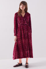 Paisley ikat inspired velvet print in rich berry jewel tones. V neck fixed wrap neckline. Flattering set in sleeve with cuff and button detail. Gentle gathering throughout waist .Fully lined. side zip. Midi length